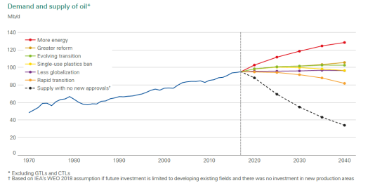 The figure above depicts the oil supply and demand in different scenarios. It is estimated that the demand for oil will reach 80 million to 130 million barrels per day by 2040. If the existing capacity is maintained and new oilfield exploration and development is not done, global production capacity will fall to 35 million barrels per day by 2040. Therefore, at least trillions of dollars of related investment will be added in the next 20 years, in order to fill the gap between supply and demand in the future.